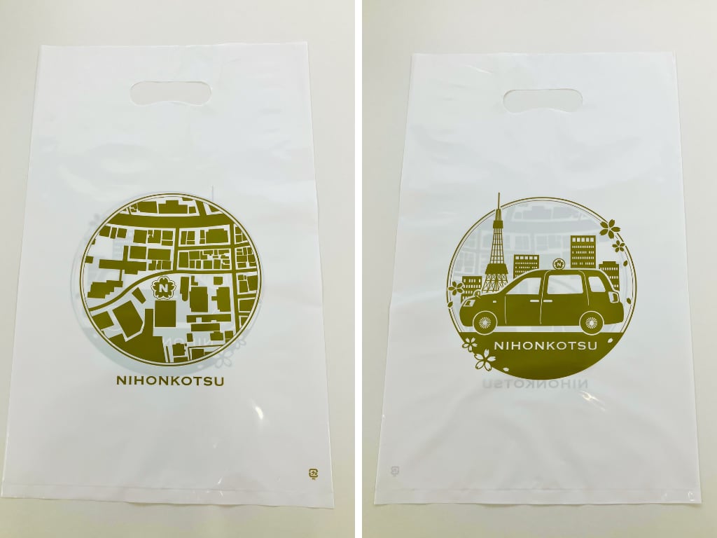 商品の購入ページのオプションで「日本交通オリジナルショッピングバッグ」を追加することが可能です。1袋100円(税込み)となります。ご家族やご友人など贈り物としてお渡しする際にご活用ください。サイズ:0.05mm(厚)×250mm(横)×400mm(縦)